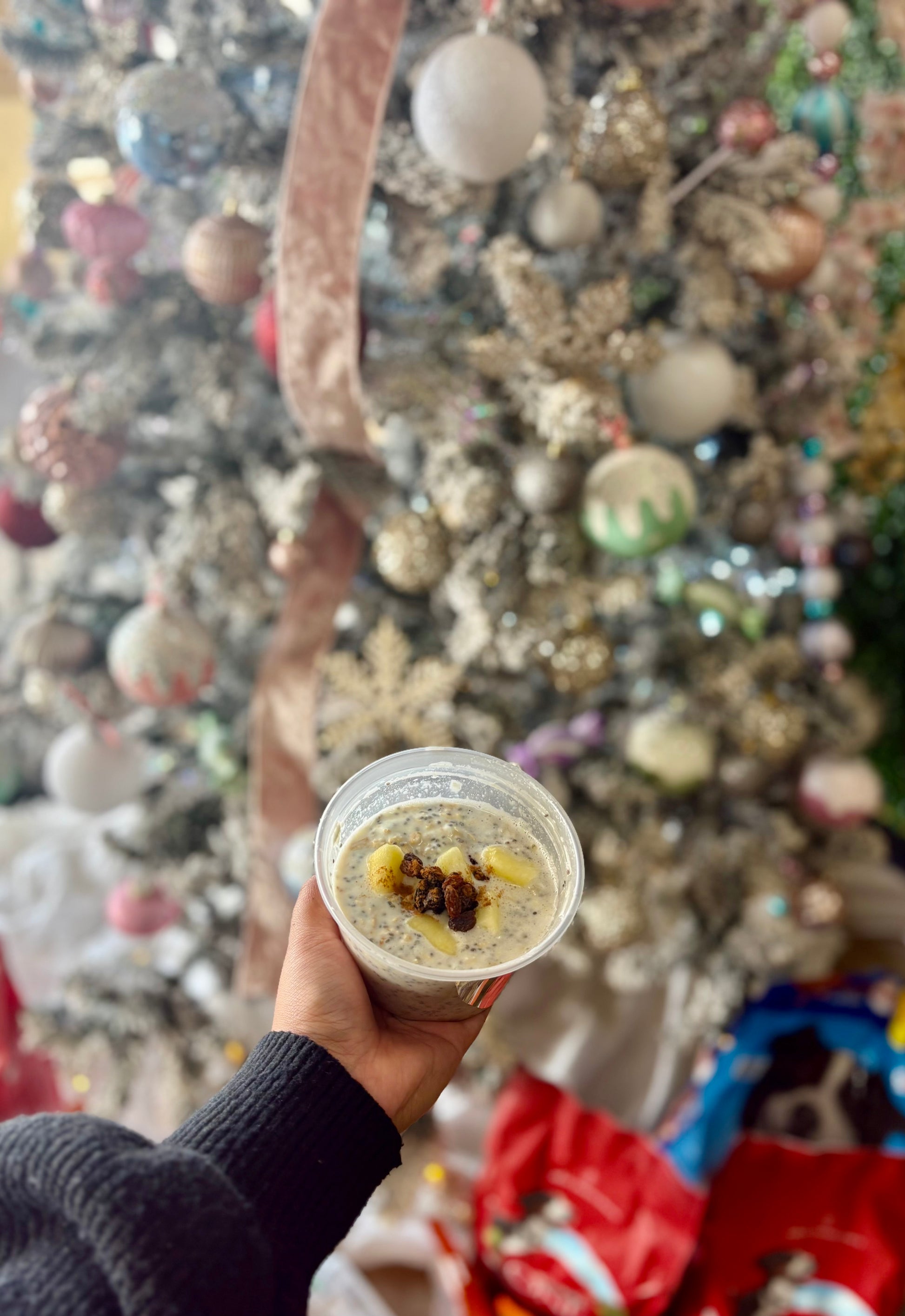 Apple cinnamon overnight oats topped with raisins with toasty holiday spices.