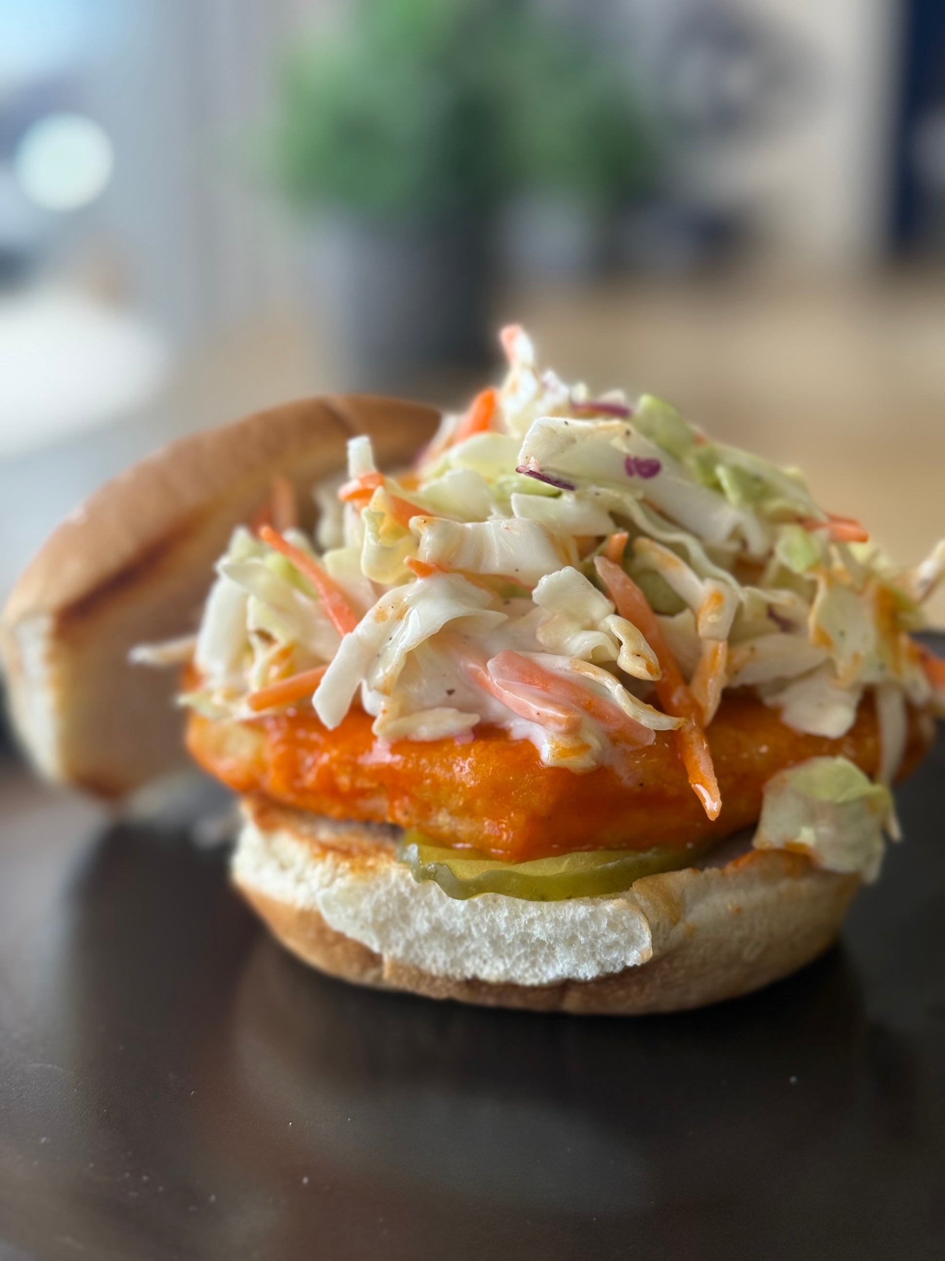 Buffalo chicken sandwich, chicken with coleslaw over white burger bread.