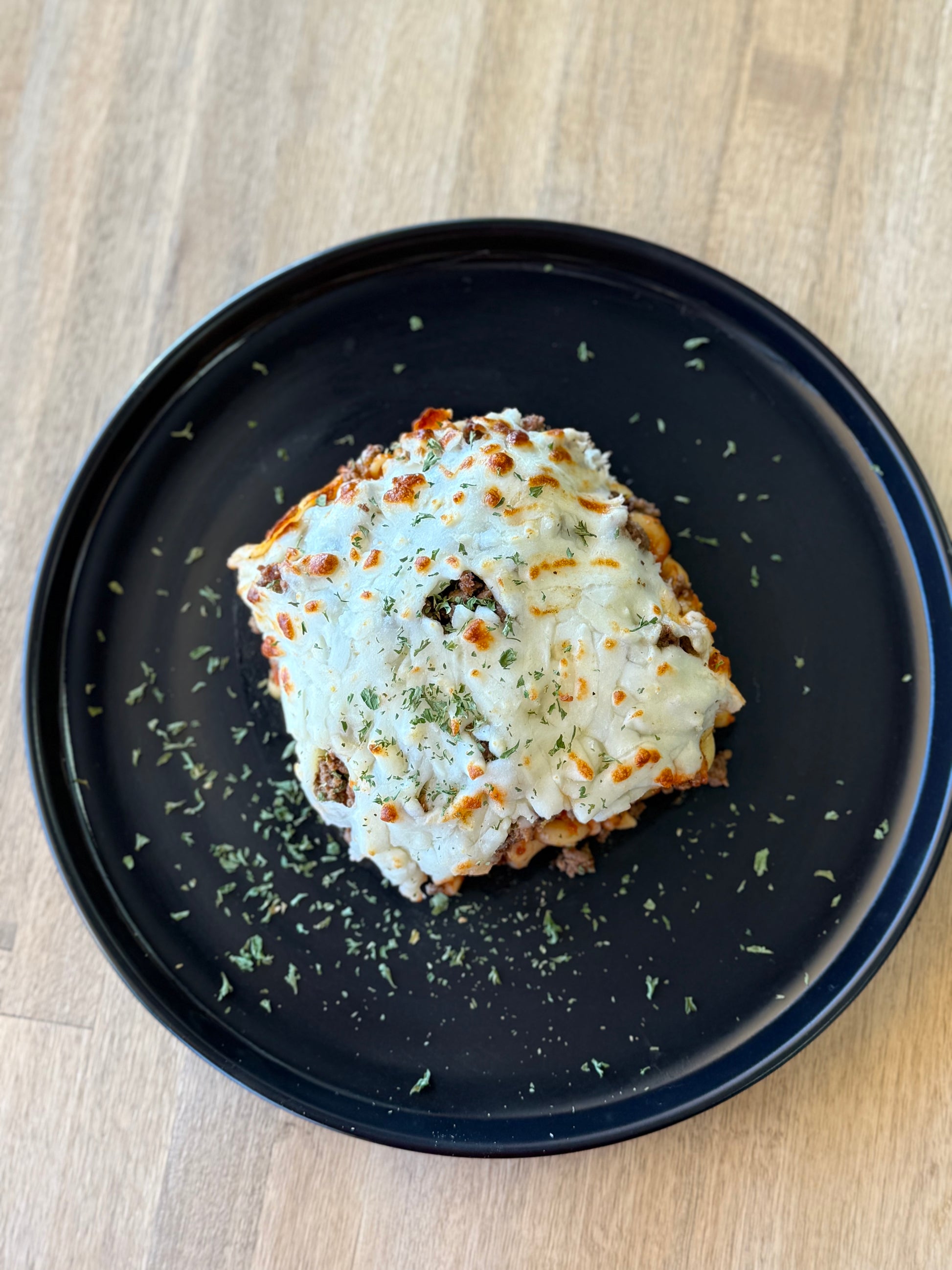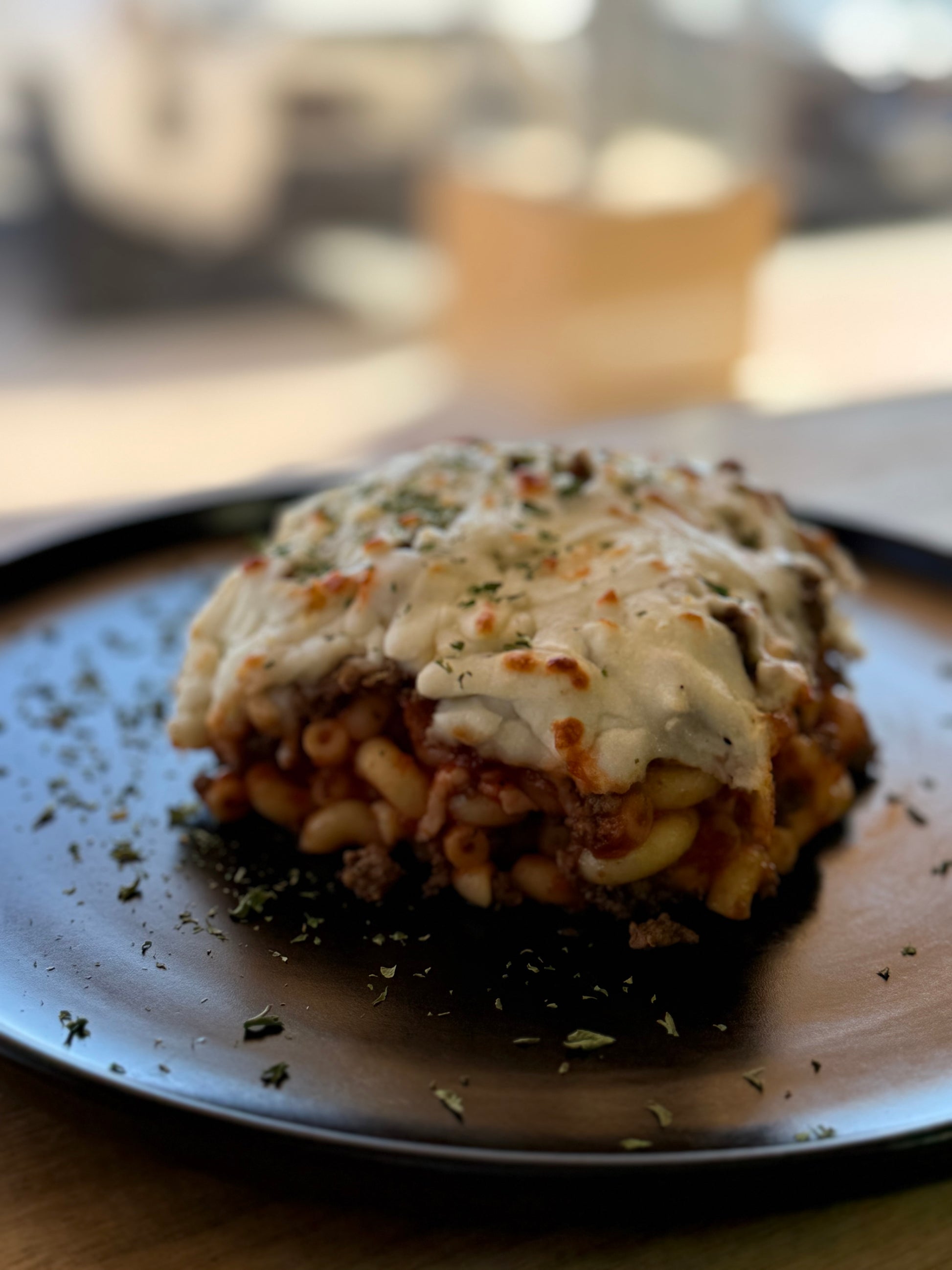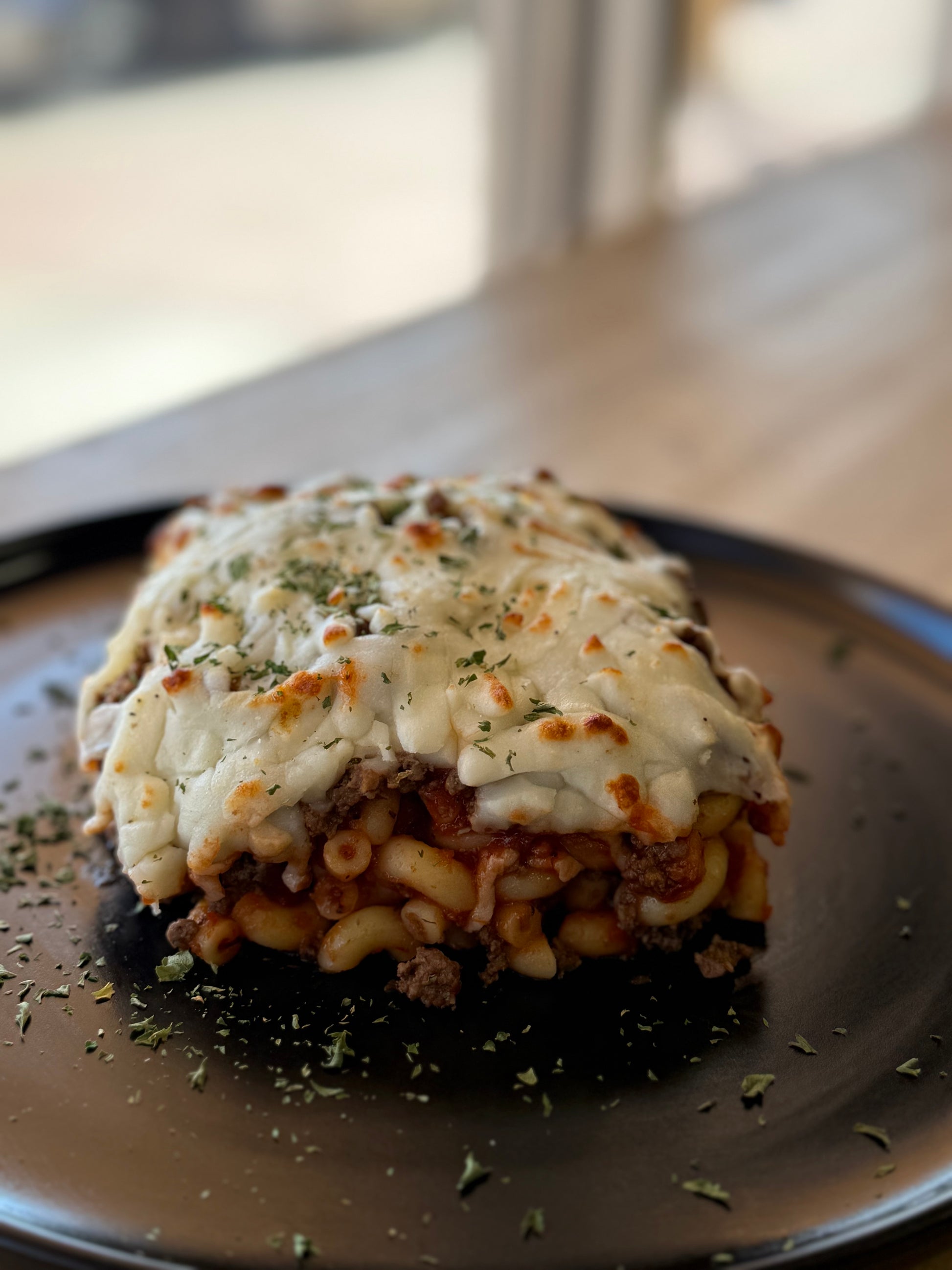 Lean beef layered casserole with macaroni pasta, cheese, tomato sauce and spices.