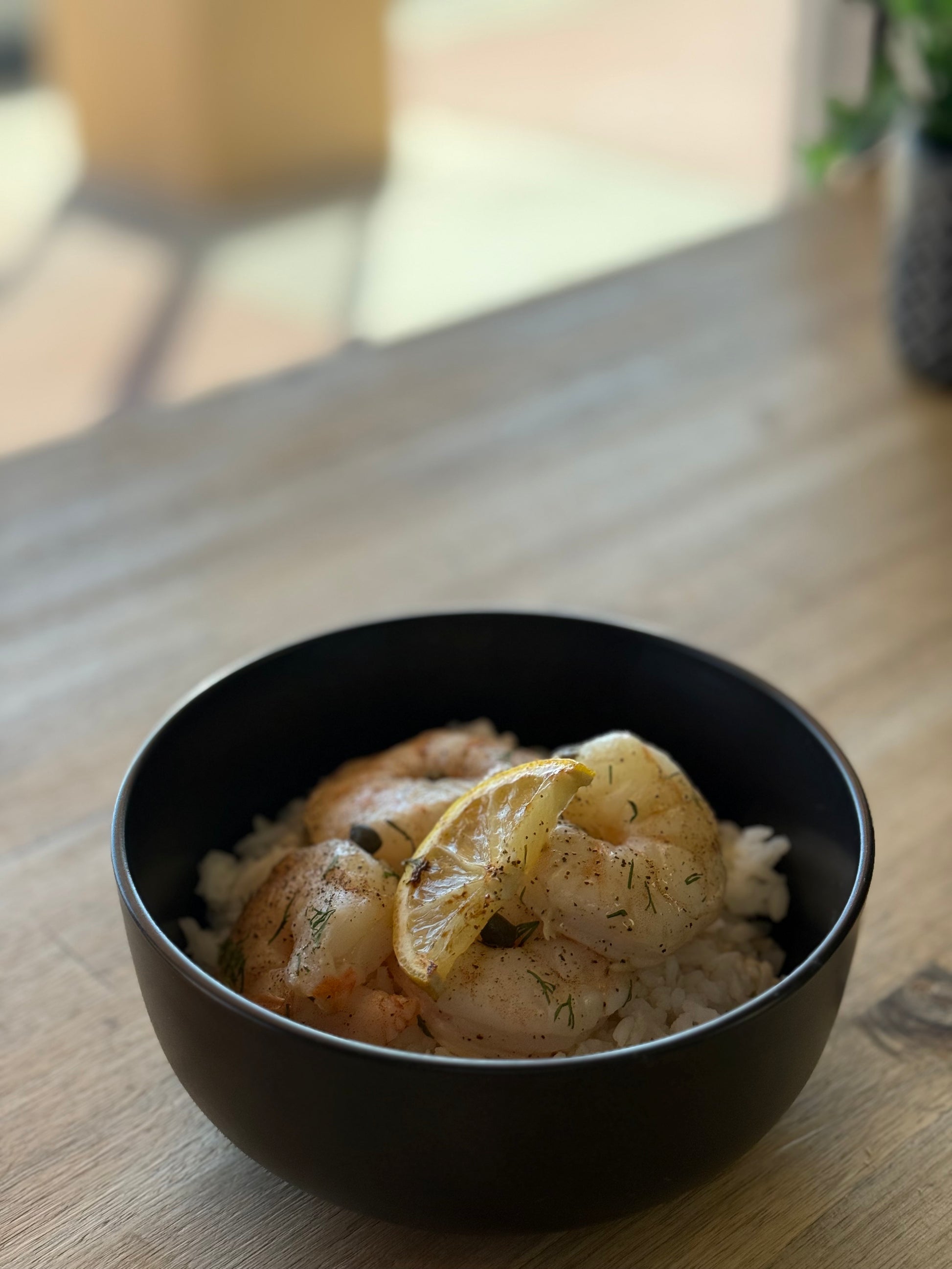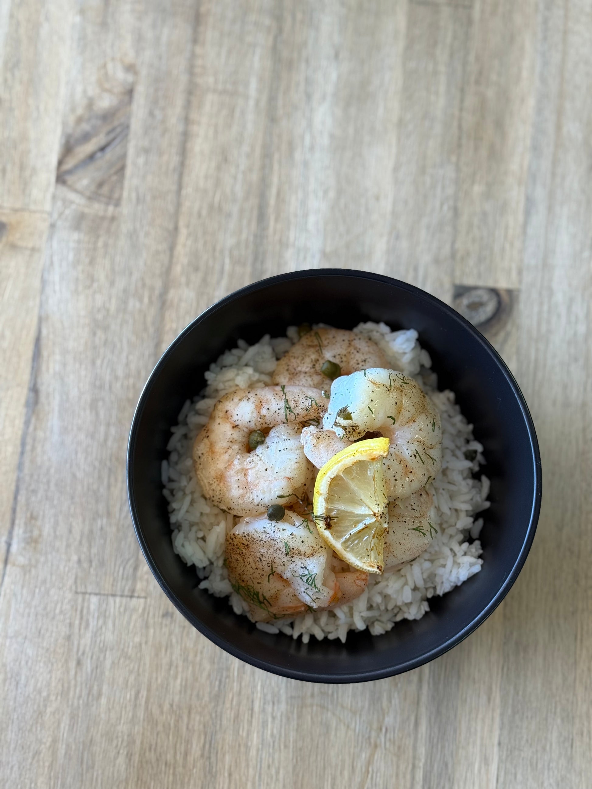 Lemon grilled shrimp Piccata, cooked in fresh capers over white rice.