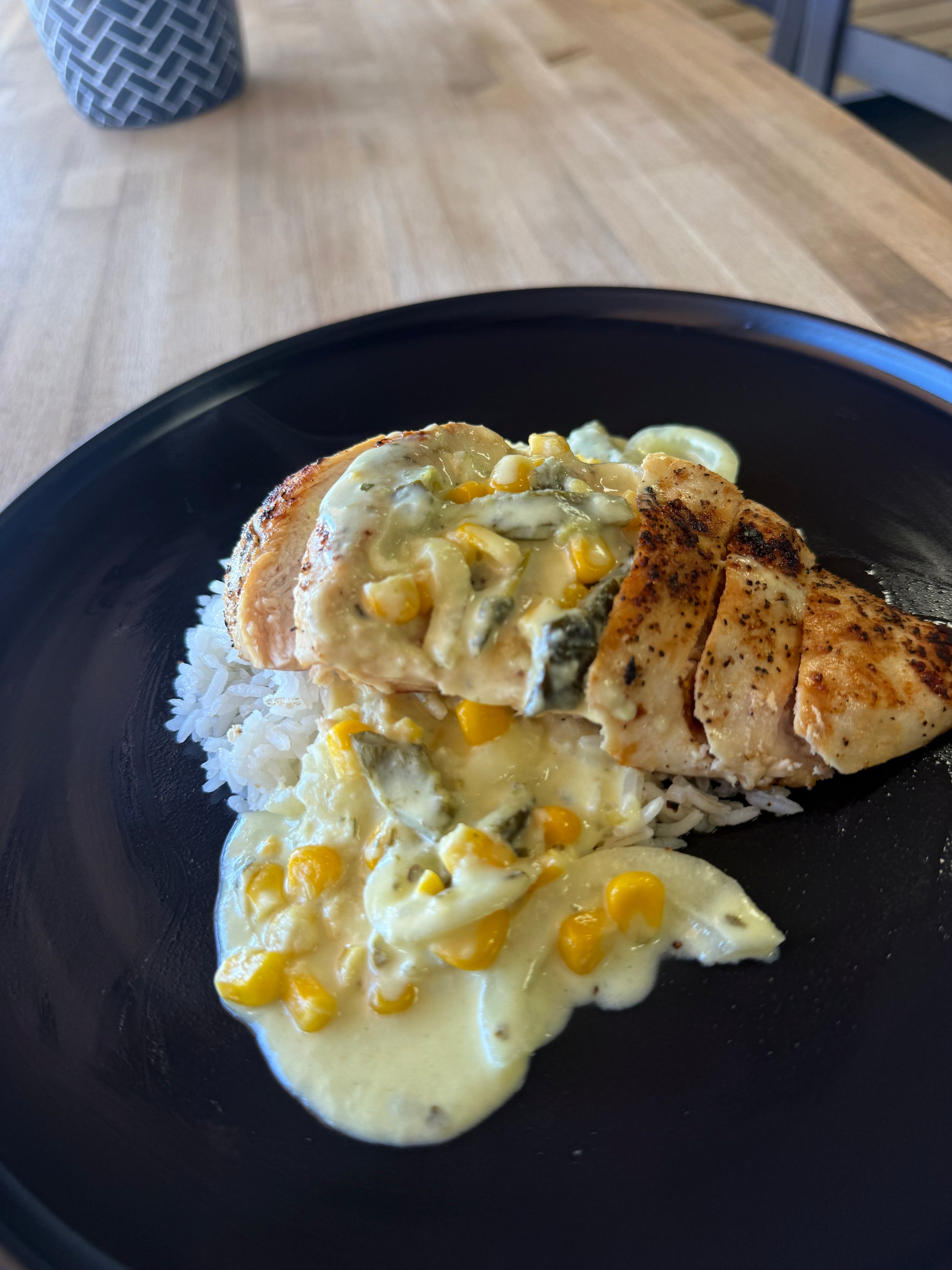 Rajas con pollo, grilled chicken breast with a creamy in house made sauce of roasted poblano chilles and corn, over a bed of white rice.